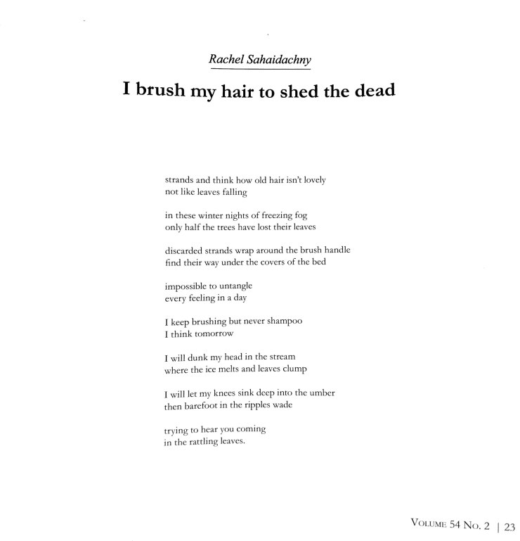 I was really honored by The South Dakota Review editor Lee Ann Roripaugh who accepted three poems for publication: “I brush my hair to shed the dead,” “It Cannot Be Called Ambition,” and “Iron Shoes” published in The South Dakota Review, Volume 54, Issue 2 (2018).